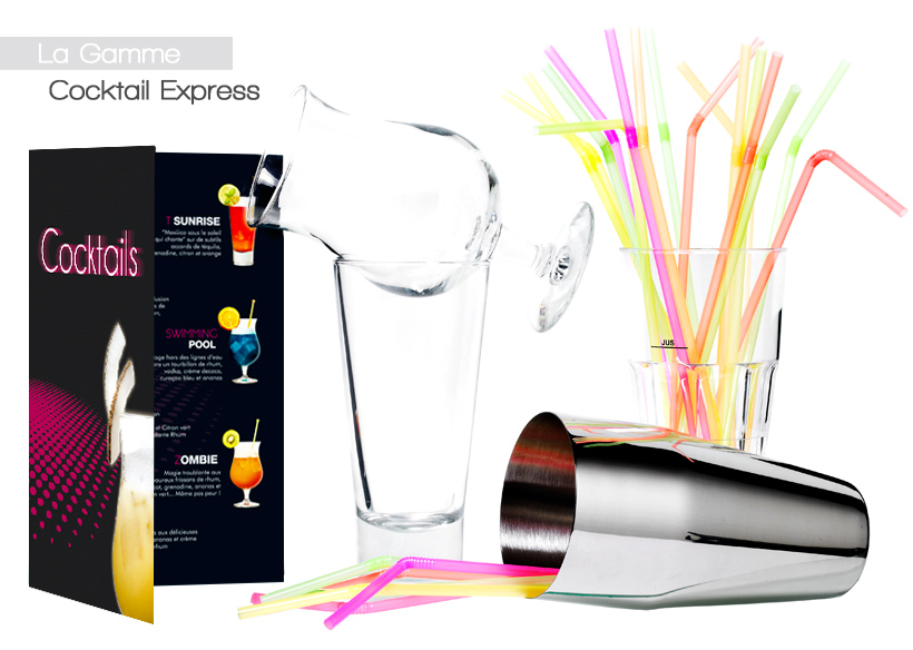 Il suffit de mélanger nos bases de préparation à vos jus d’orange ou jus d’ananas et votre cocktail est prêt. Un shaker et un verre doseur serviront à animer la préparation. Des verres à cocktails et des pailles mettront en valeur la présentation aux clients.